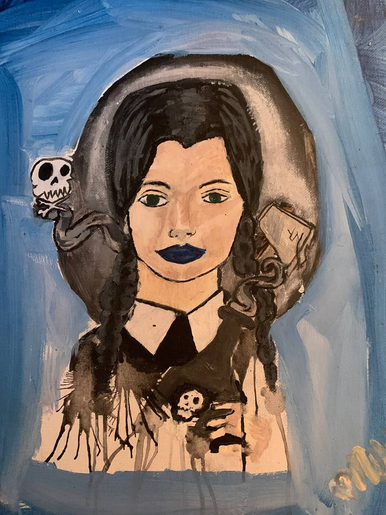 Another fan aet i did in highschool that needs a good home. This portrait of ms adamsfestures her with an ax in the background a cute skull and shes holding a bottle of poison thats leaking toxic fumes.