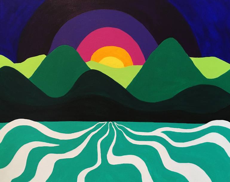 This is an imagined landscape inspired by where I live, the West Coast of British Columbia Canada. I love the way the colour radiates out and back in again. I enjoy painting with bold colour. This piece is part of the We Are One Collection.