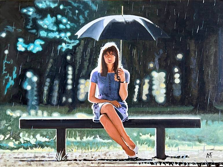 I tried to capture the lonely reflection of a young woman waiting for someone who might not come. The caress of the rain and the shelter of the umbrella aid in introspection. Using oil, I sought to express the mastered calm in this moment isolated but connected to nature. This painting inspires a to...