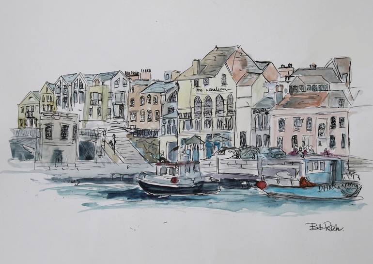 A pen and watercolour sketch of Weymouth Harbour on the coast of Dorset in the UK