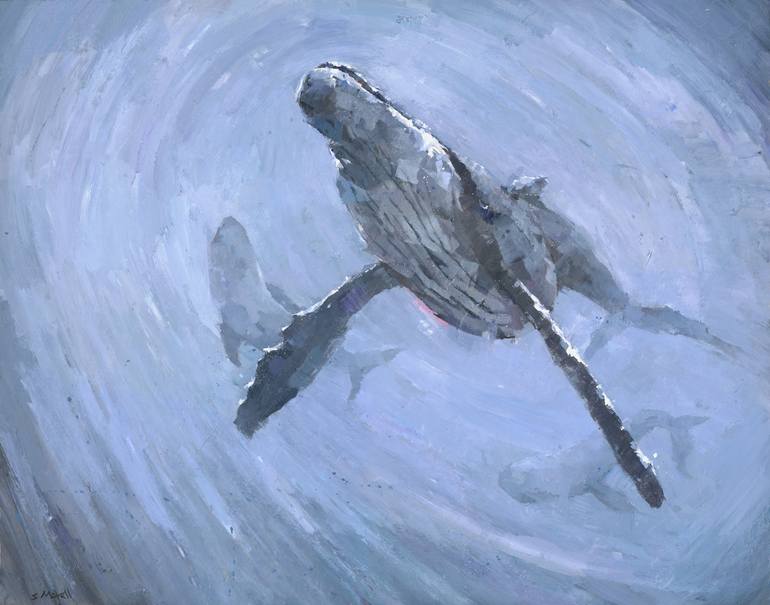 A humpback whale gracefully swims through swirling waters, depicted in soft, muted blues and grays. This is an original, one of a kind, acrylic painting. It is ready to hang in a simple but elegant black stain wood frame, as pictured.