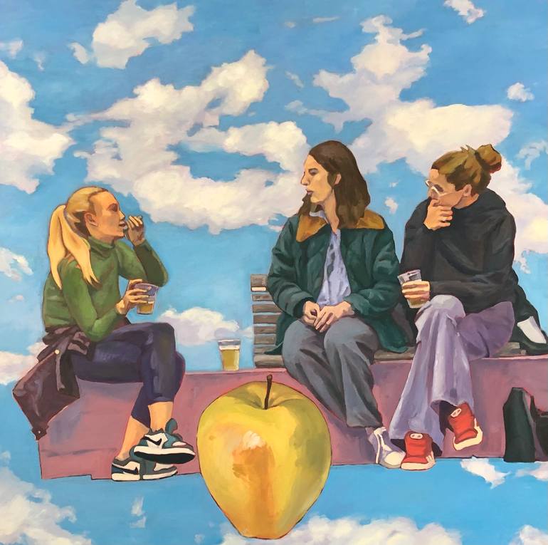 Three youthful deities discuss the fate of Europe, in the proximity of the political elections, the apple is to be understood as a terrestrial globe.