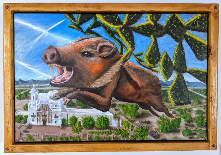 Behold "When Javelinas Fly," a one-of-a-kind oil painting that marvelously captures a fantastical javelina soaring with prickly pear cactus wings above the historic San Xavier del Bac Mission. This exclusive work of art stands alone worldwide in depicting the Spanish Catholic mission from an angelic...