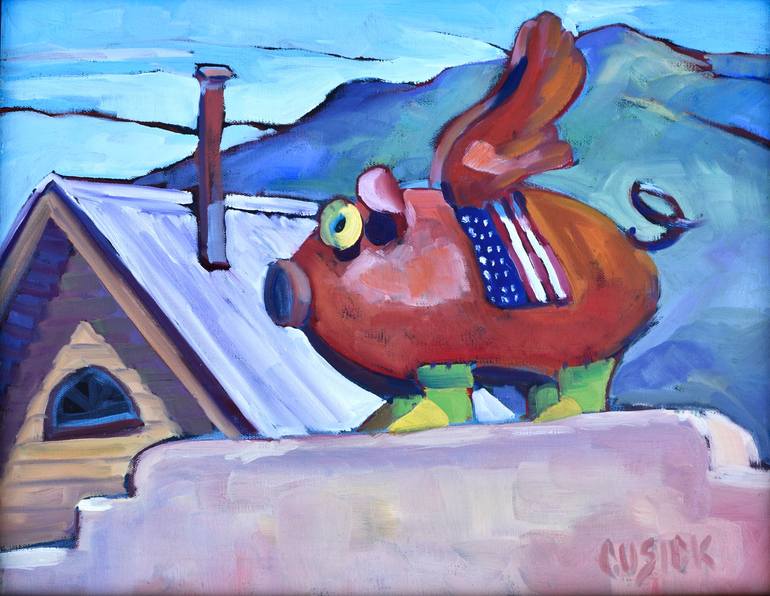This whimsical winged pig draped in the protection of the flag is a celebration of the American spirit and the enduring quest for going after the impossible.