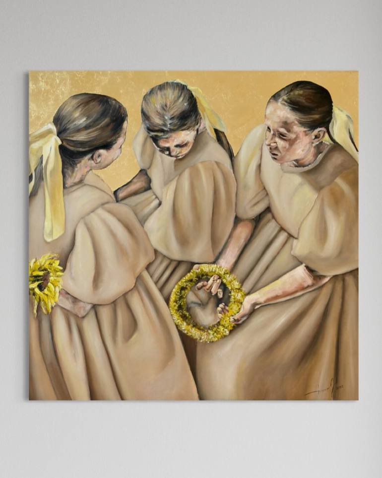 Exclusive to Saatchi Art Gallery As a title of the artwork, the artist chooses words by Dzhokhar Dudayev, the 1st President of the Chechen Republic, who said in 1995 interview: "russia will disappear from the face of the Earth when the Ukrainian sun rises." Three young women stand as the central ...