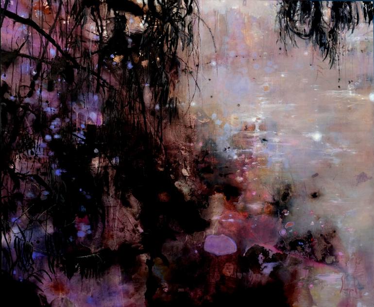 The composition of this painting is influencend by Japonism and I`m interested in the interplay of transparency and illegibility.