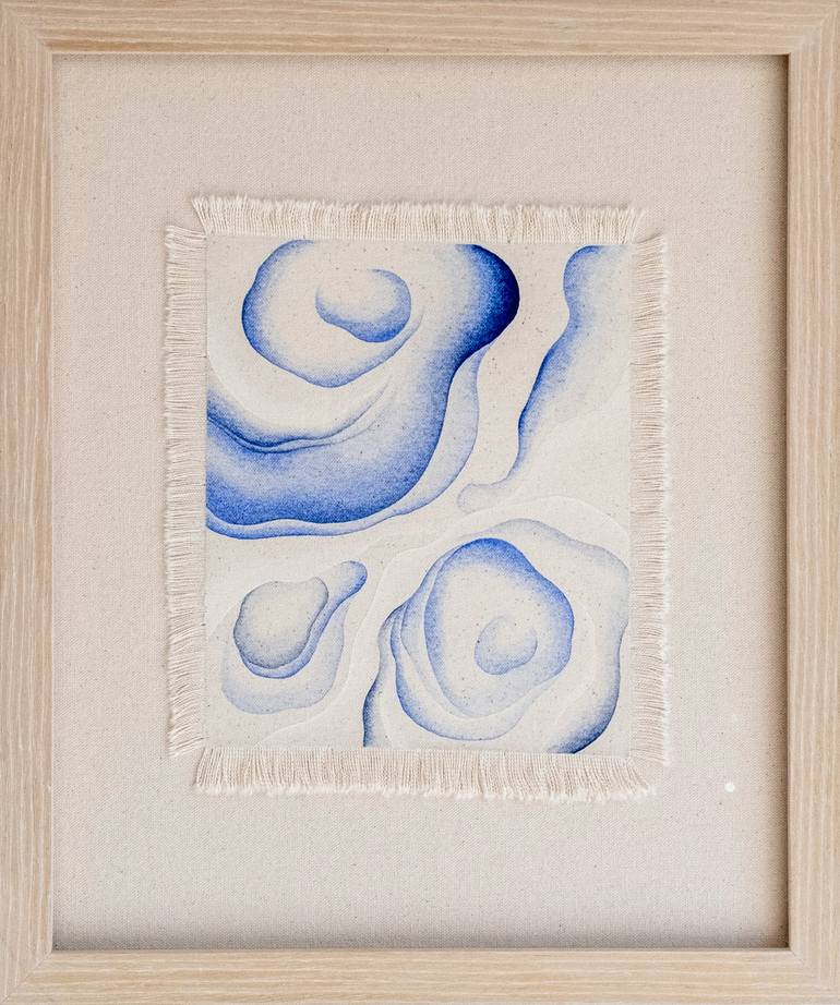 A story of eternal love and shape shifting between stone and water. The edges of the painting are frayed by hand then sewn on canvas. Custom framed, protected by non-reflective art glass, and ready to hang.