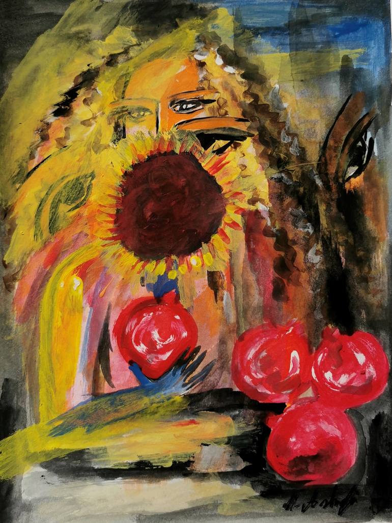 This painting holds a piece of my own imagination, a space where a woman's enigmatic presence meets the poetic language of oriental art and nature. The sky, pomegranates and sunflower are invitation to dream. What secrets do you see reflected in her gaze? What stories do these elements whisper to yo...