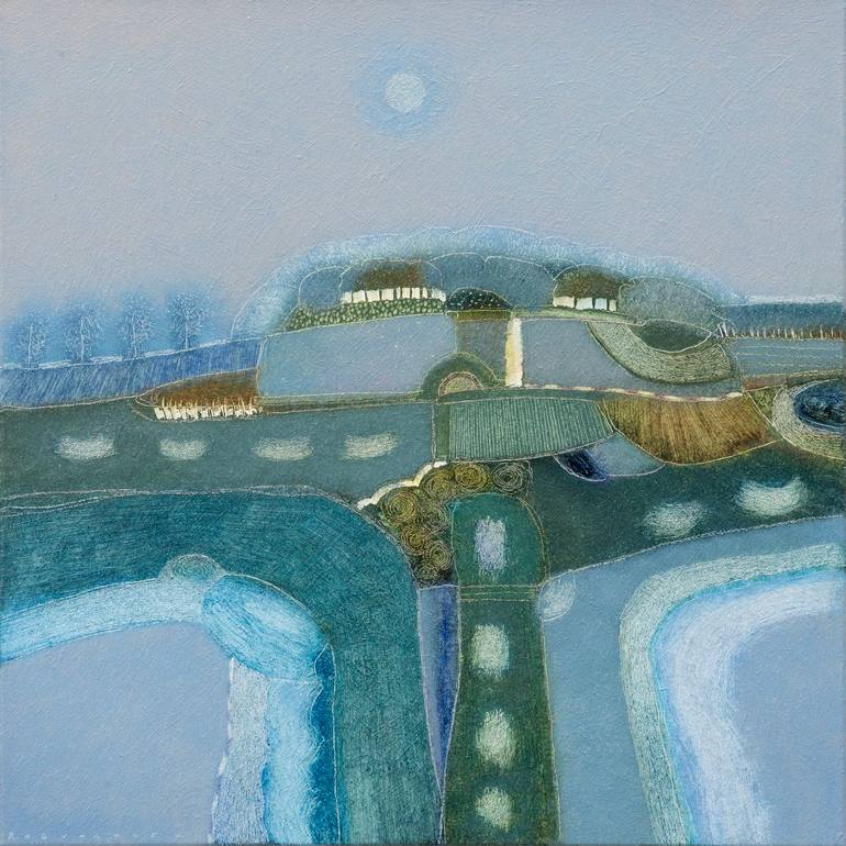 Evening landscape in blue colors. The title is from a song by Borknagar. (All the titles of my paintings are parts of song lyrics). Painted on quality canvas, ready to hang. The sides of the canvas are painted as well. It ships in a box-frame, but can hang without perfectly.