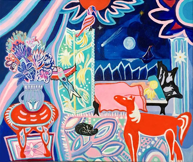 A summer night, in a peaceful bedroom with a view. The cat sleeps on the rug..while dreaming all imaginary creatures visit us.. The sides are painted, so there's no need to frame it. Ready to hang! Signed on the back.