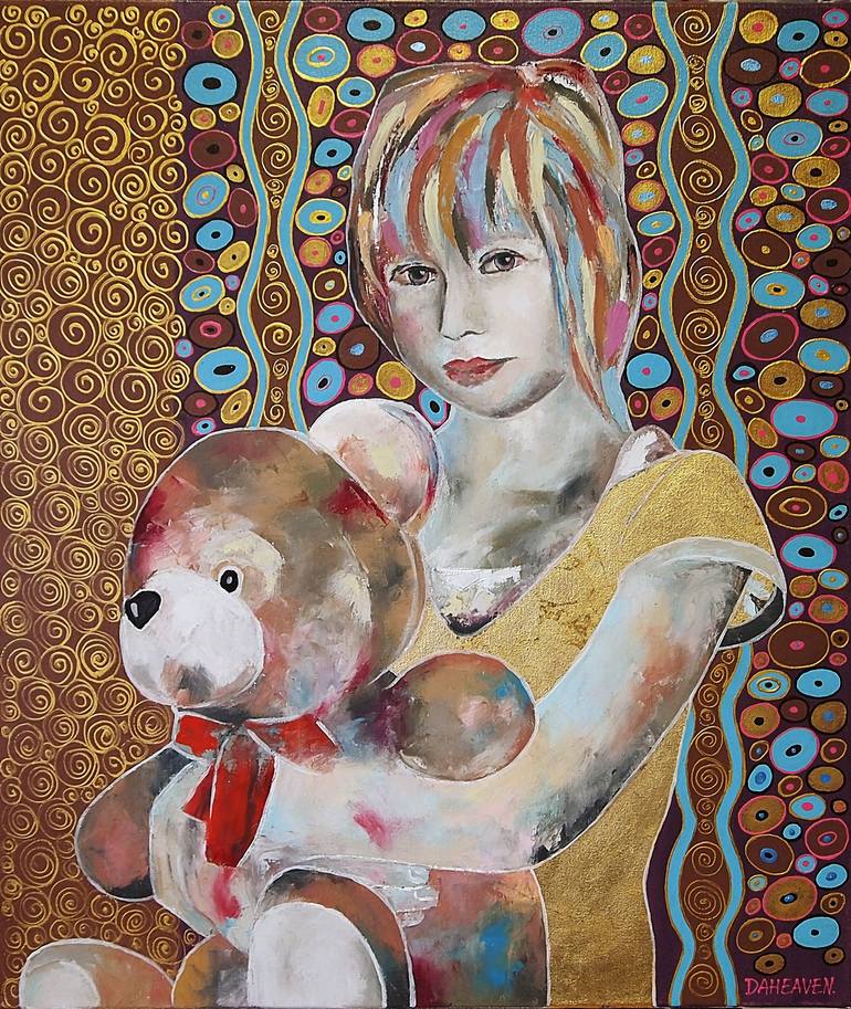 Whimsical Childhood Memory - Vibrant Acrylic and Oil Painting. 60X70cm, oil, acrylic, gold leaf on canvas. Step into the magical world of childhood with this captivating Whimsical Childhood Memory painting. The innocent yet knowing gaze of a child will transport you to a place where curiosity reigns...