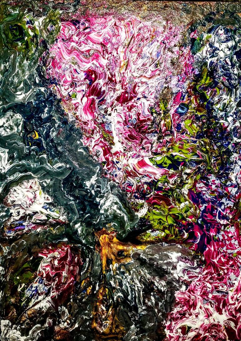 This artwork is a vivid display of abstract expressionism, with swirling and dynamic paint strokes that create a sense of motion and fluidity. The bright pinks and purples contrast against darker shades of green and black, suggesting an emotional intensity that captures the viewer's attention. The t...