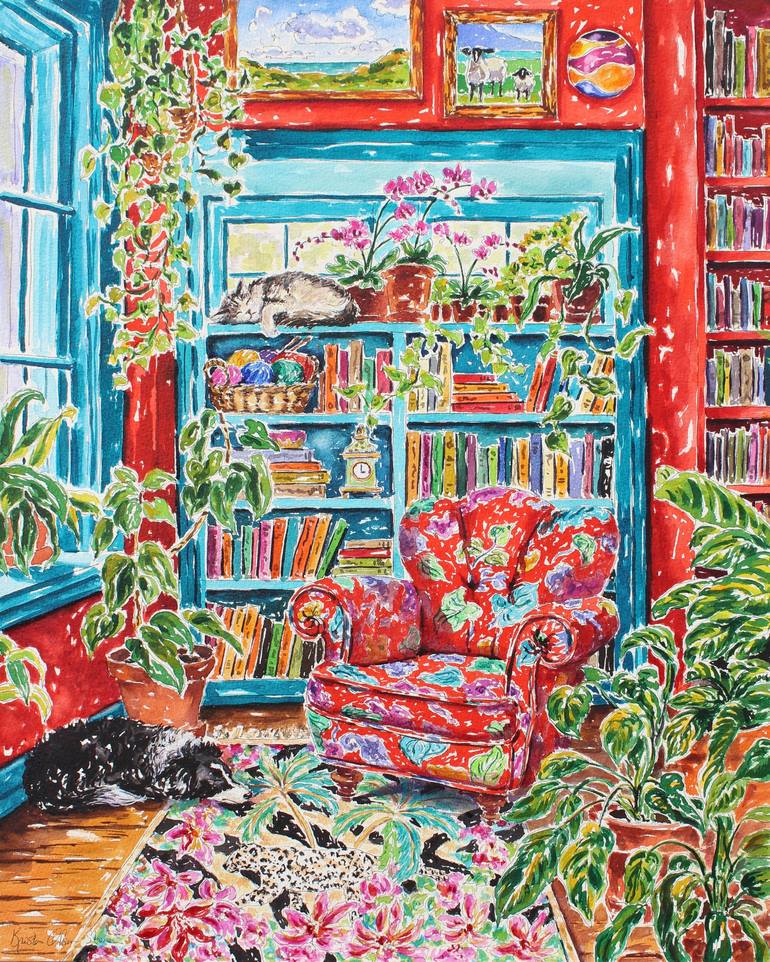 An original 20" x 16" or 50.8cm x 40.64, watercolor and ink painting. I just love this room! I can visualize sitting in the gorgeous chair, surrounded by plants while knitting or enjoying a good book and relaxing in the warmth and beauty of it all with my furry friends. This painting comes with a ...