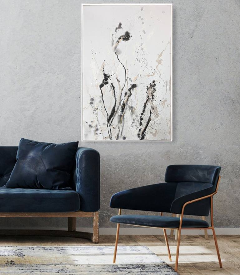 This white frame allows the elegant floral artwork featuring wild flowers in shades of white, cream, warm beige, gold and black. The metallic gold gilding changes in the light - like sunlight filtering through the flowers. The flowers show dappled gold blooms and several unopened buds painted in a w...
