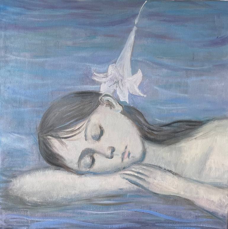 Whisper for me until I fall asleep As a plant lover, I think plants also have the ability to communicate with people. In this painting, I depicted a girl lying in a pool with a white lily reaching her ear, the lily is telling the 's a gentle condition and emotion that I want to show the viewers of m...
