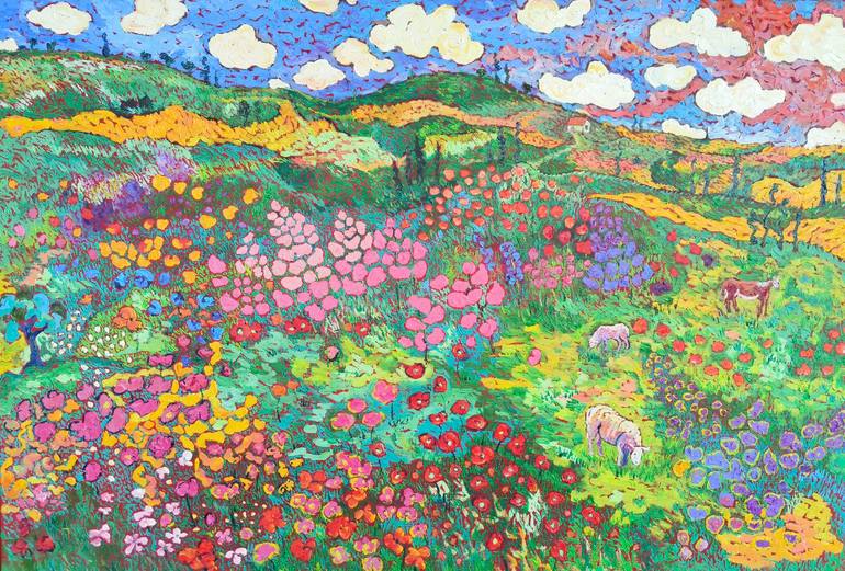 This vibrant oil painting bursts with life and color, depicting a dreamy countryside meadow in full bloom. The rolling hills are cloaked in lush greens and golden yellows, while fields of flowers—ranging from poppies and roses to lilacs and daisies—create a wild mosaic of reds, pinks, purples, and o...