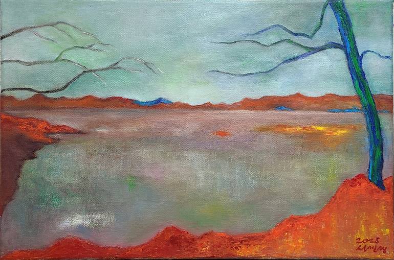 This surreal landscape painting merges the arid beauty of a desert with the fluidity of an imagined lake, creating a dreamlike interplay between reality and illusion. The foreground shimmers with the reflective qualities of water, a surreal and unexpected presence amidst the dry, rust-colored terr...