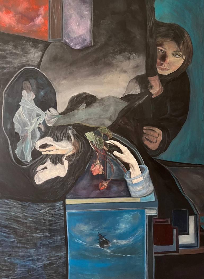 "Whispers" is a deeply symbolic and surreal painting that invites viewers into a world of mystery and emotion. The composition blends human figures, dreamlike reflections, and organic elements, creating a narrative that feels both intimate and enigmatic. The use of muted tones, contrasted with deep ...