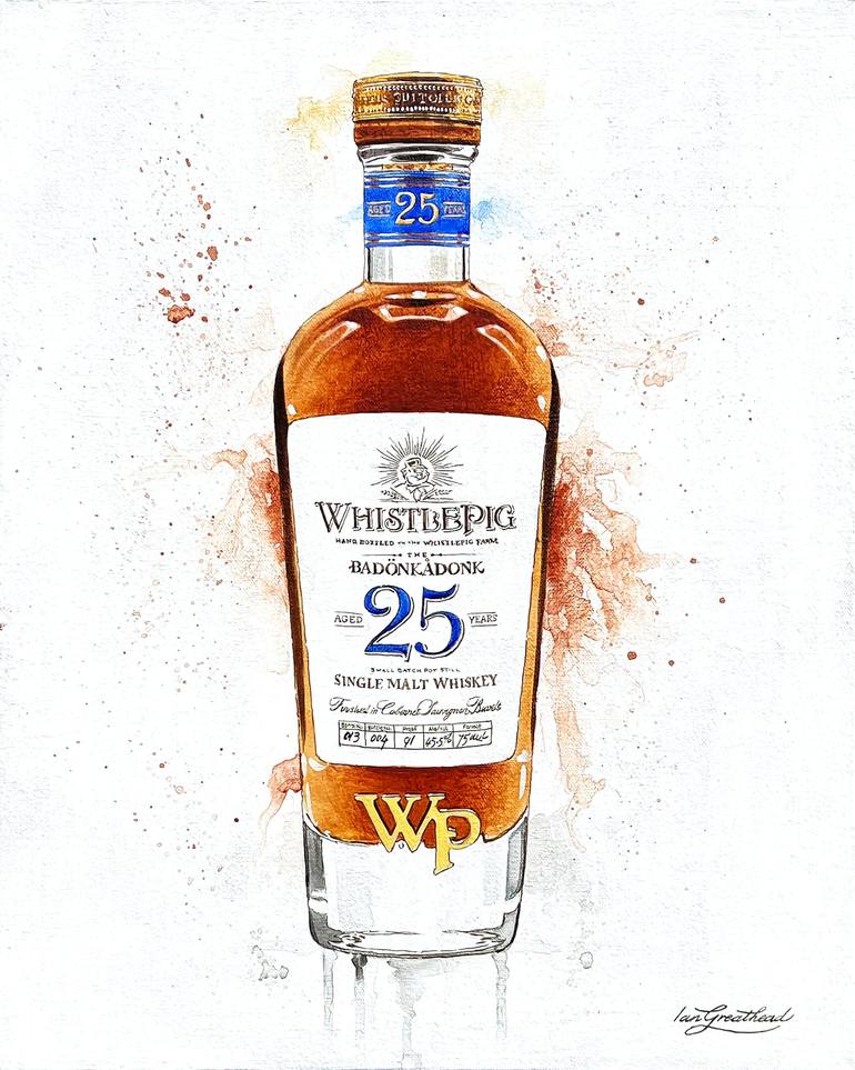 Ian Greathead's acrylic masterpiece! Capturing the allure of WhistlePig Badonkadonk 25. This original acrylic painting on canvas celebrates a quarter-century journey, starting in new American Oak and finishing in Silver Oak Cabernet Sauvignon barrels. Elevate your bar or man cave with the essence of...