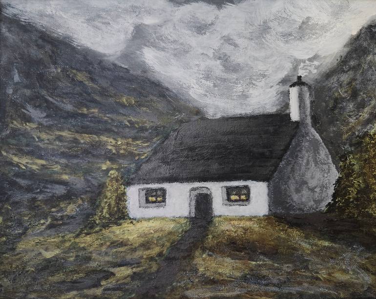 A small white cottage with a dark roof sits near the mountains under a cloudy gray sky. The scene of the cottage with its chimney and a fog rolling in at night conveys a sense of solitude and warmth. The cottage was painted on a flat 11x14 canvas panel with acrylic paint. I was inspired by an image...