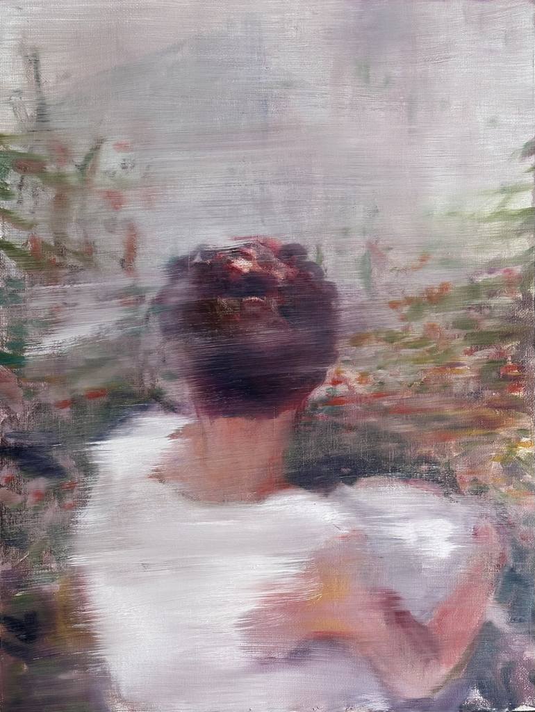 Painted a young woman, sitting in the grass, surrounded by flowers. I tried to catch a moment which could be freedom or pure innocence.