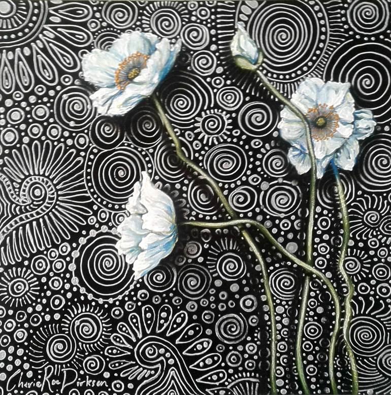 I am captivated by poppies with their intricate, delicate petal and stamens. They never cease to draw my attention in and make me wonder about intelligent design...or more, make me laugh at those who dispute it. My trademark gold and silver spiral backgrounds represent the life-force energy that...