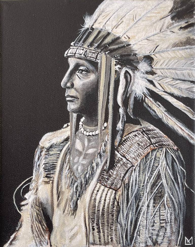 A portrait of Chief White Shield. He was my grandmother’s grandfather. The overall mood of the portrait is one of quiet strength and unwavering resolve. Arikara Chief White Shield refused to be a party to a lie. When pressured to sign for supplies the tribe never received, he stood firm, his integri...