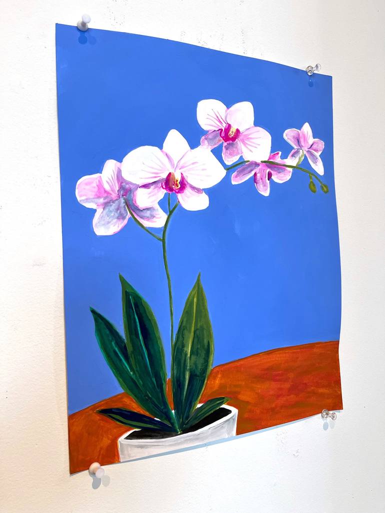 One in a suite of orchid paitings against a royal blue background. In this series, I am contrasting the painterly flowers and plants against the flat background. Signed, dated, and titled on the back, unframed.