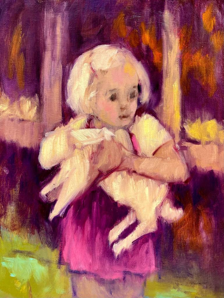 A tender moment, softly captured in oil. This small-format painting portrays a blonde little girl gently holding a white rabbit — a timeless image of innocence and quiet affection. Inspired by an old photograph and reimagined through a vibrant, unexpected palette of purples, pinks, emerald greens, a...