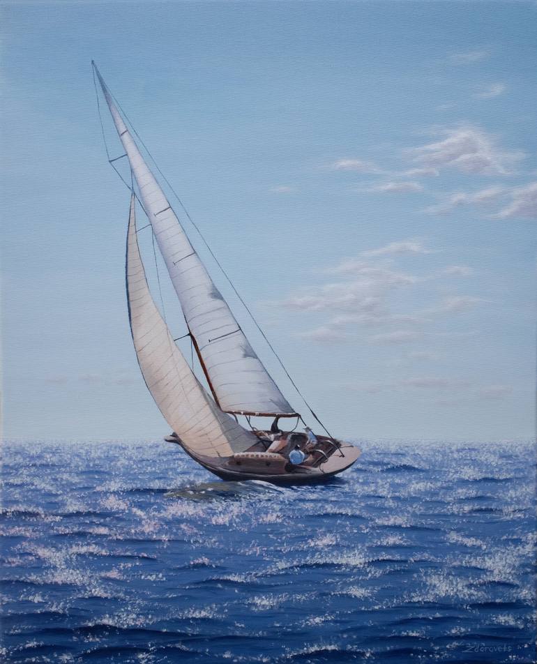 Sailing boat in the middle of nowhere. Boundless blue sea surface, sun splashes, calm sunny day and sailors in search of freedom. The painting was completed on 50 x 40 cm canvas. All edges have been painted for direct hanging without frame is so desired. (No frame included) Painting have been signed...