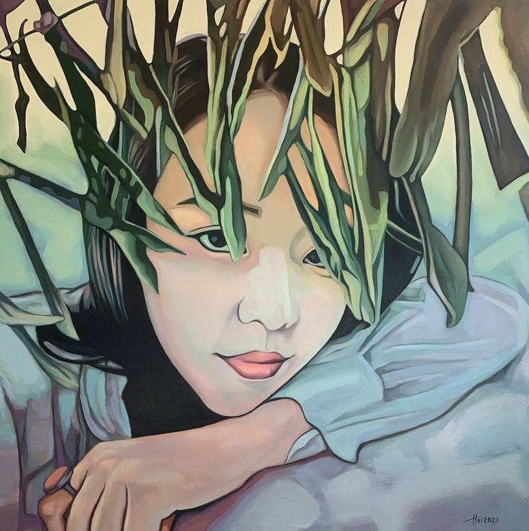 A little girl, sent me a picture, eyes and demeanor attracted me. The delicate tones of the medium of oil painting and the popular pop style inspired my expressive impulse. Through the flowers and plants, the charming eyes of a young and beautiful girl highlight the pure quality of life in the cool ...