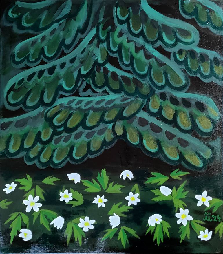 Inspired by a brief descriptive scene in a novel by Leida Kibuvits called "Ladybug Red". White delicate wild anemones under a dark green lush spruce tree.