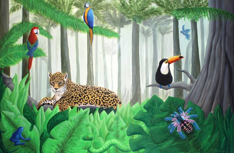 This is original acrylic painting on canvas. Size: 100x70 cm. It shows foggy brasilian jungle with beautiful exotic animals. Seladonia fowler, frog, jaguar, toucan and parrots. The prints are available.