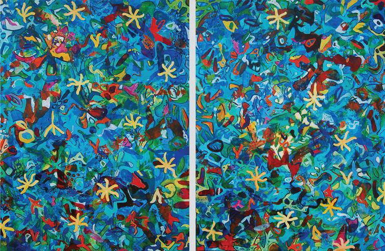This is the second of a series of blue garden paintings. Nature inspired. Linear, graphic, colourful, playful and positive. I love to layer and discover accidental imagery as a result of overlapping shapes and colours. What I see will be different each time I look at the painting, and the same goes ...