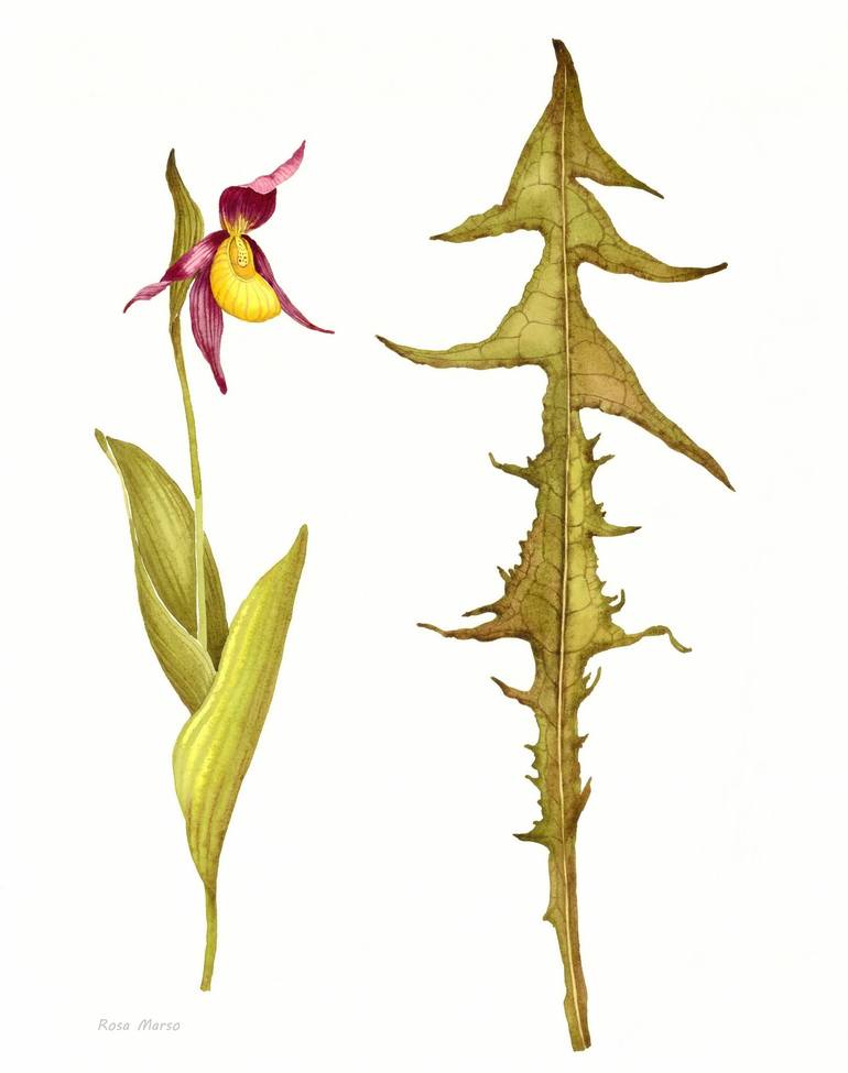 This is my favorite wild flower, the Lady's Slipper Orchid. It is a very rare and beautiful flower that blooms in early summer. And the dandelion leaf, which I chose for its beautiful lines and shape. I like these plants together. but in fact, this watercolor could be cut in half and framed in two a...