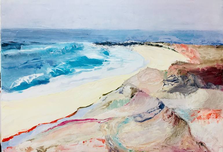 A wild windswept beach. Swirling sand in colourful marbled patterns. Crashing waves. Thick sumptuous oil paint Celebrating the bright and the bold and the beauty of nature. Cies island, Galicia, Spain