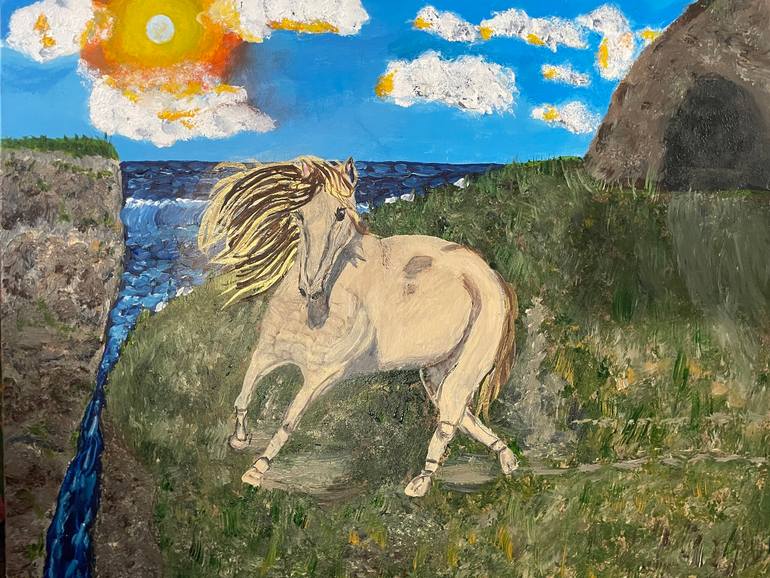 This is my original acrylic painting of a horse named Wildfire just like this song. This horse has wild spirit and is now playing chicken with a cliff just having fun. She has a golden mane flying in the breeze. I’ve always loved horses and freedom and the ocean that’s why I chose this subject this ...