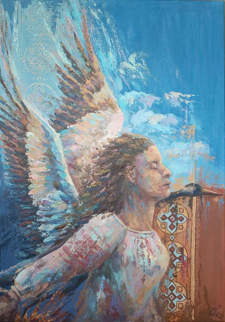 A woman with outstretched arms, a blue sky, a boldly raised face and a crane flying behind her. Her whole image symbolizes strength, freedom, human will... She trusts this strength, she knows that she was born free and open to life. The dynamics of the lines, fluttering hair, like bird feathers, ec...
