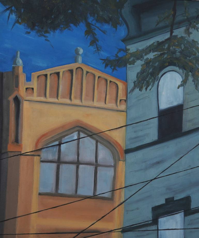 Painted from a picture taken outside a local bakery with outdoor seating during a summer day. Perfect weather, telephone lines cutting the image into pieces. The real Brooklyn.