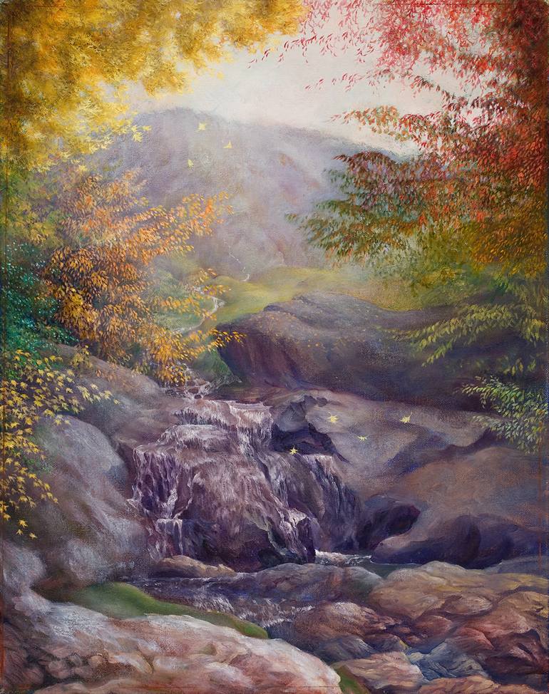 My land has been a deep inspirational source for much of my artwork. I regularly paint al fresco. This scene of a stunning waterfall captures the beautiful and emotion of water in motion. This represents the inspiration of Autumn in nature.