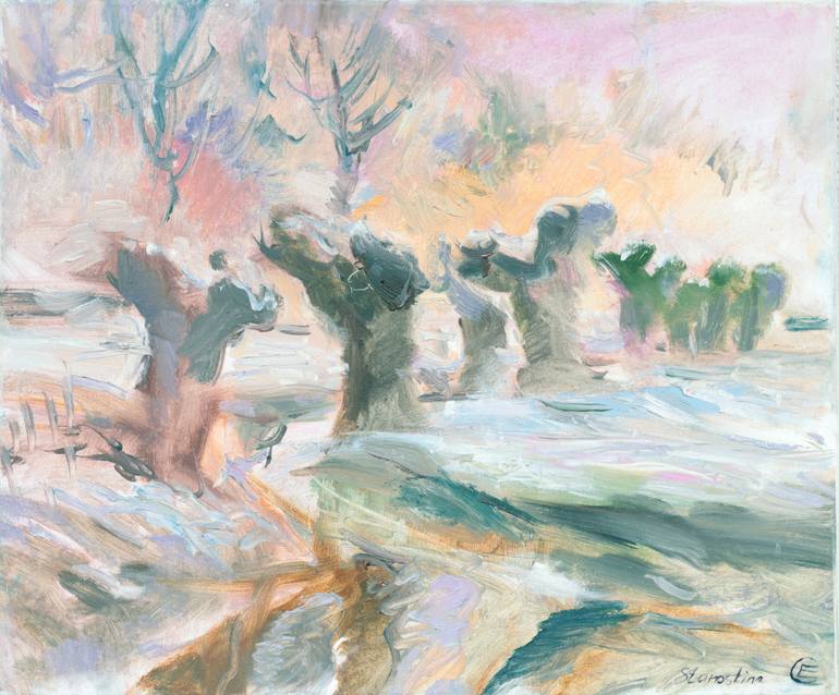 Willows at sunset. Winter. Windy. Nuances of the winter palette. This painting is part of my series of works inspired by the changing seasons and the effects of light on the natural landscape. In this piece, I depict a serene winter scene, where the bare willow trees contrast with the colorful sky ...