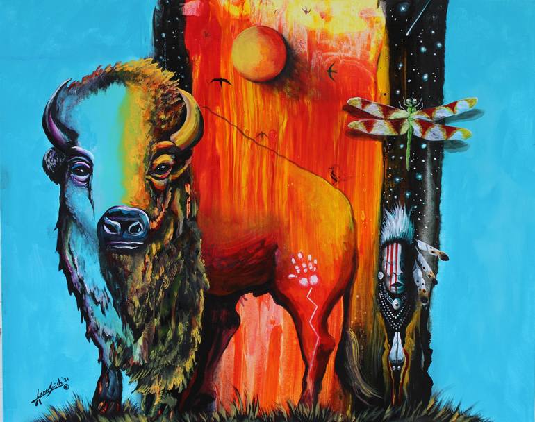 The painting is a representation of the Lakota story of creation from wind cave. My wife is Lakota and helped me develop the concept of the painting It depicts native people coming from the stars and the form of creation. It also represents the dragonfly and Buffalo and their significance and role i...