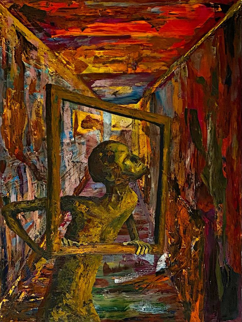 I do not share the personal meaning of this piece so as not to influence the viewer's experience. I intended a three directional perspective: The vanishing point of the hallway in the background, the direction of the foreground window and the orientation of the figure's gaze towards the top right.