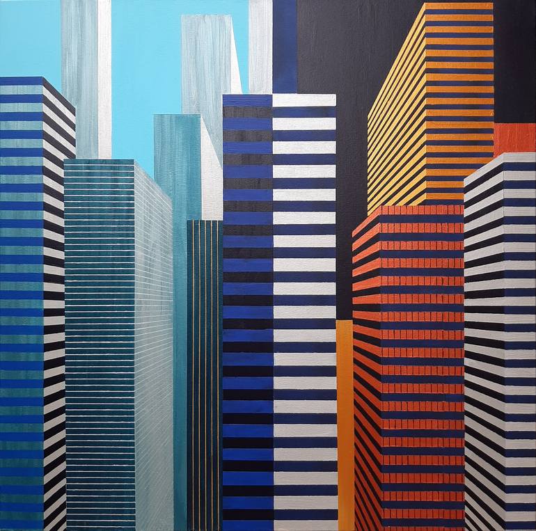 The artwork Window XII was inspired by architecture and the city was created from my imagination. Day and night light are combined in one painting, yet the composition of the cityscape is intact. It was painted directly on the canvas without the use of any drawing program, photography, or projector....