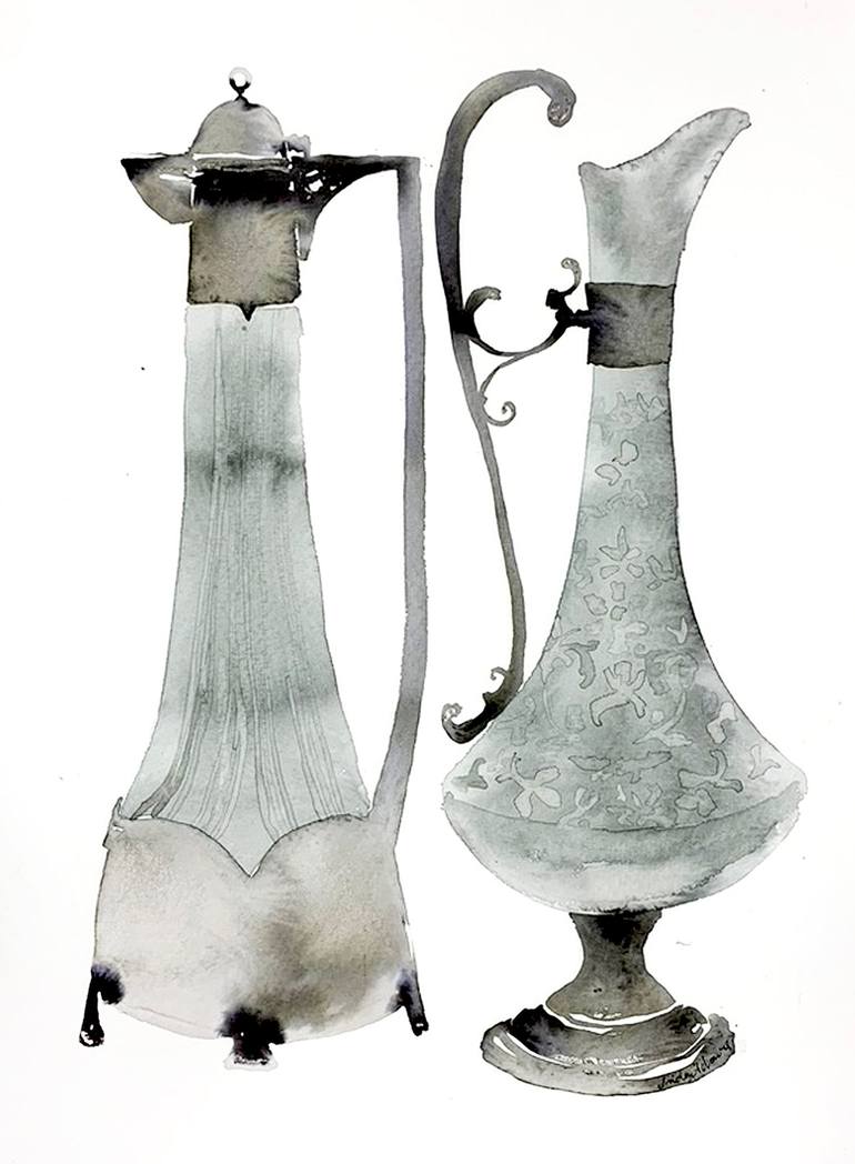 Ink and Caplain gold leaf on lightly textured watercolour paper. Mounted in a single ivory mount. Aperture: 27cm x 36cm Mount: 43cm x 53cm