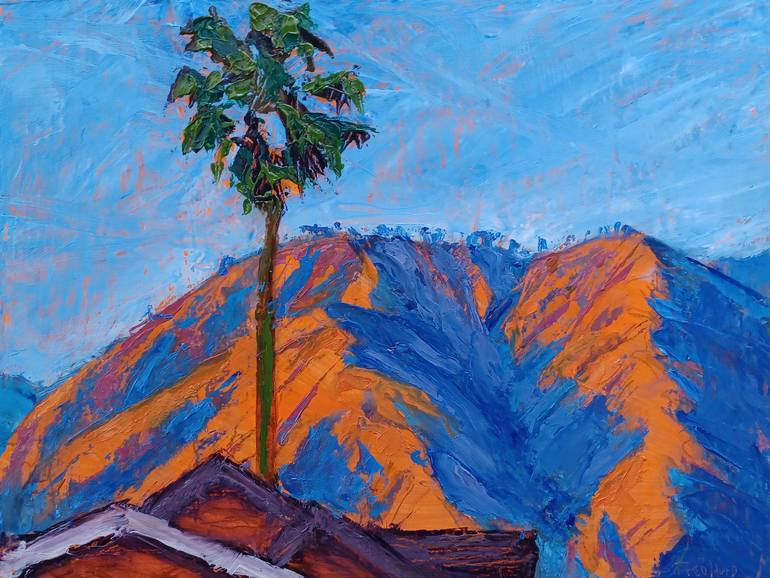 "Wings of the Seraph" captures a moment of resilience in nature. Painted en plein air, this small oil painting on wood panel depicts the landscape looking northeast toward Eaton Canyon in Pasadena, California, after a wildfire. The artist's expressionistic style conveys the emotion and energy of th...