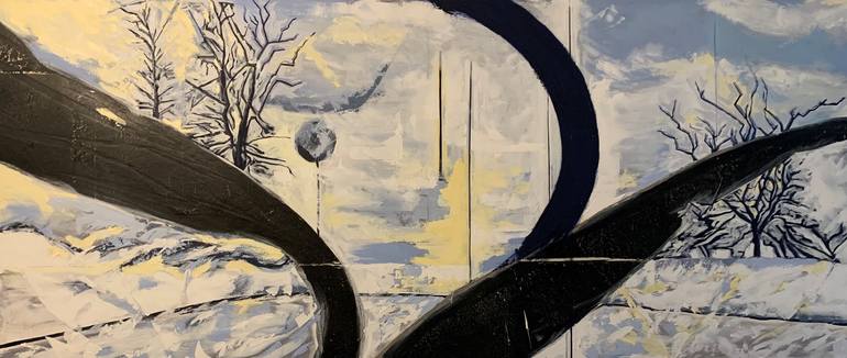 This painting is inspired by the winters in the North Pennines, Cumbria, where I live and work. It is a fusion of thoughts, feelings and imagery taken from walks in the landscape during winter 2020/2021. It is ia combination of oil and non-recyclable plastic on canvas, with the large sweeping blac...