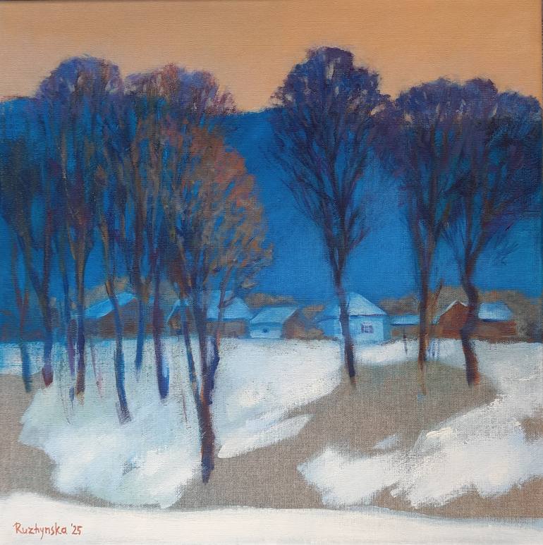 "Winter Morning" conveys the atmosphere of a frosty dawn in a snow-covered village. Deep blue hues evoke a sense of freshness and chill, while the soft morning sky brings harmony and serenity. Tall trees stand motionless in silence, casting long shadows over the snow. Behind them, small houses appea...