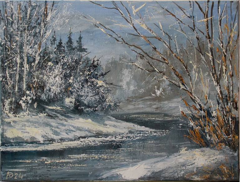 This captivating oil painting on canvas showcases a serene winter landscape, filled with calm beauty and tranquillity. The scene features snow-covered trees and bushes alongside a gentle, frozen river. Bare branches stretch across the composition, adding texture and detail, while soft hues of gray, ...