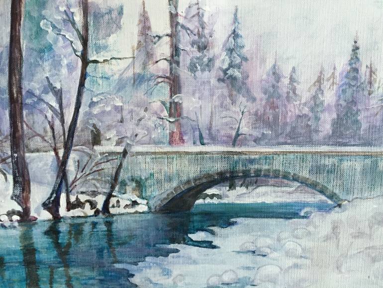 Tranquility is the inspiration. The soft shades of blue, purple, green pull you in and suggest rest and calmness. Painting in this watercolor style brings a flow and transparent-ness which works here. Feel the zen of this winter scene.